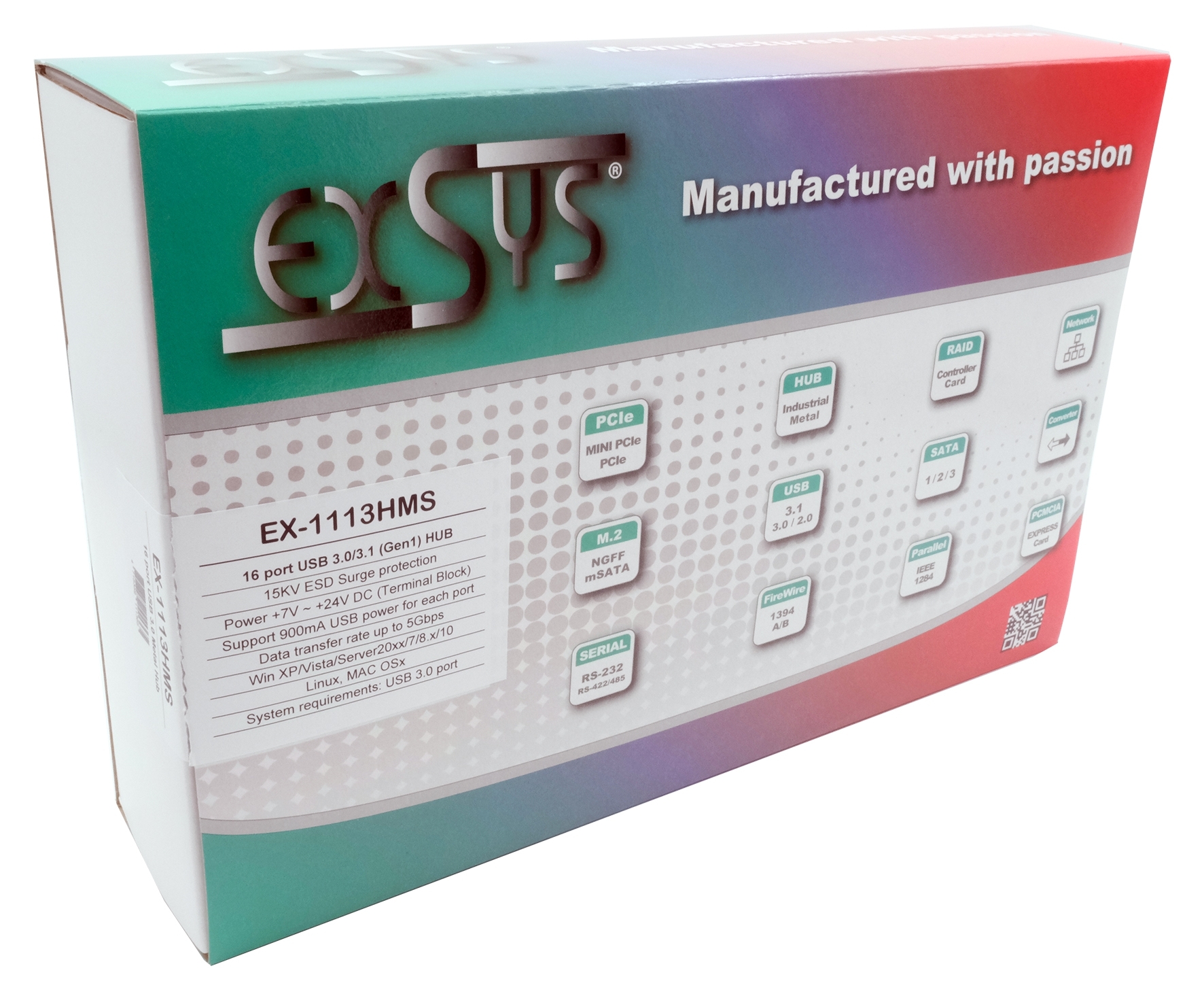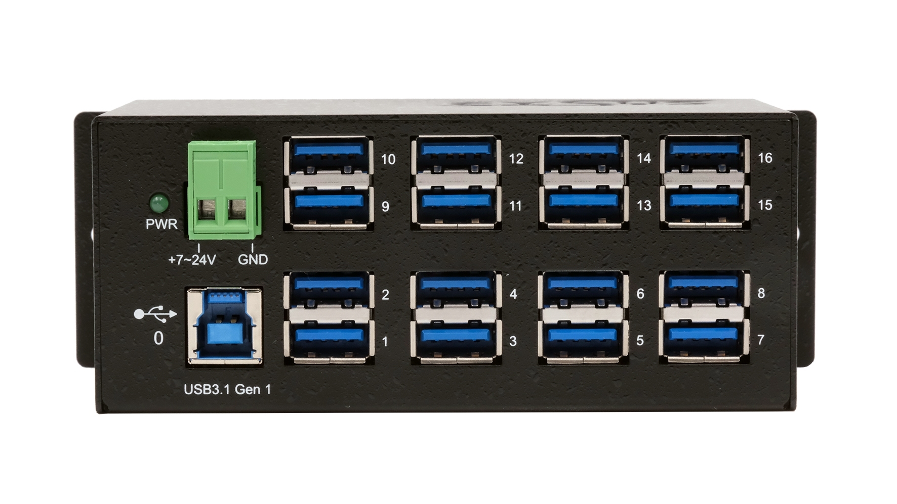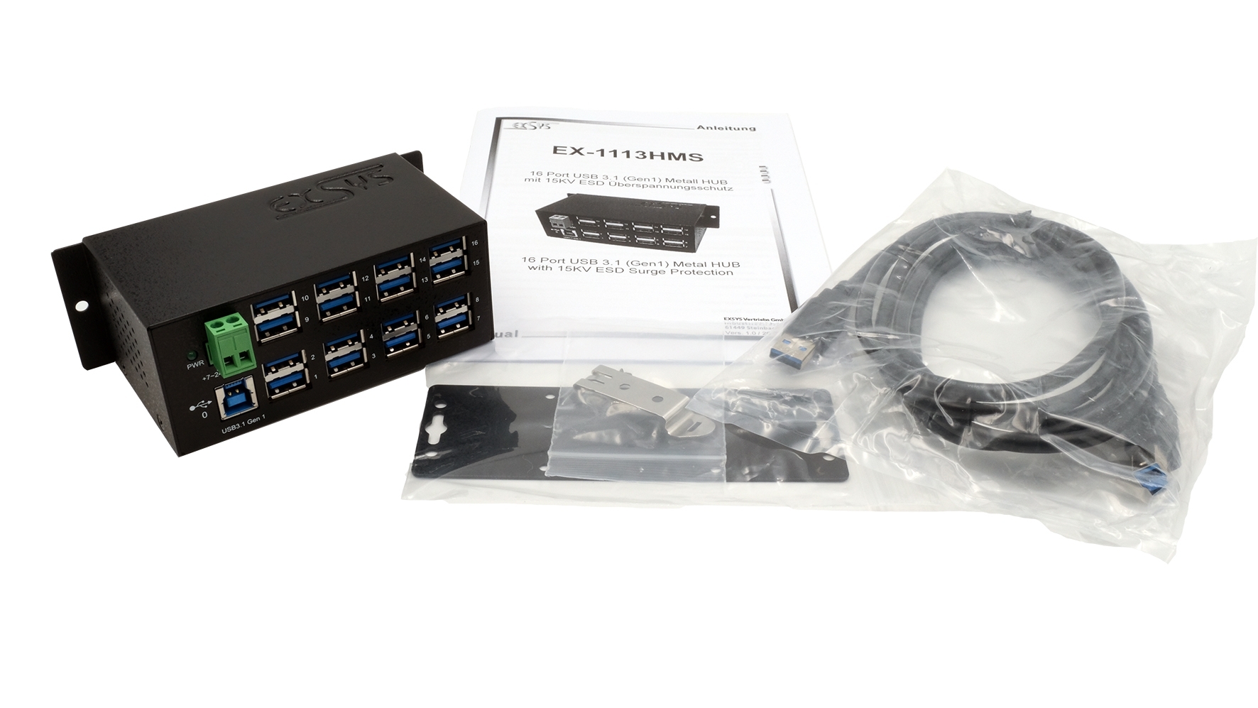 Der robuste, industrietaugliche EX-1113HMS Hub stellt sechzehn USB 3.2 Gen 1 Downstream-Ports mit 15KV ESD Überspannungsschutz zur Verfügung. Es ist somit möglich bis zu sechzehn externe USB Peripheriegeräte an einen USB 3.2 Gen 1 Port vom Rechner in einem 19" Rack anzuschliessen. Er unterstützt die SuperSpeed USB 3.2 Gen 1 Datenübertragungsrate von bis zu 5Gbit/s und ist abwärtskompatibel bis USB 1.1. Der EX-1113HMS kann mit USB-Bus Power oder über einen zweidrahtigen Klemmleisten-Anschluss (Self-Power) mit Strom versorgt werden. Im Self-Power-Betrieb können an jedem USB Port 900mA zur Verfügung gestellt werden. Der HUB erfüllt die speziellen Anforderungen von Industrieanwendungen.
