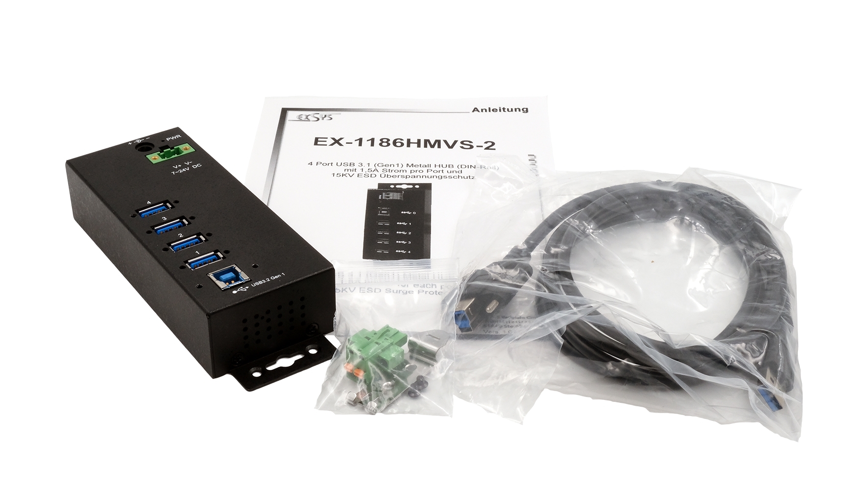 EX-1186HMVS-2, USB 3.2 Gen 1 Kabel, DIN-Rail Kit, Handbuch