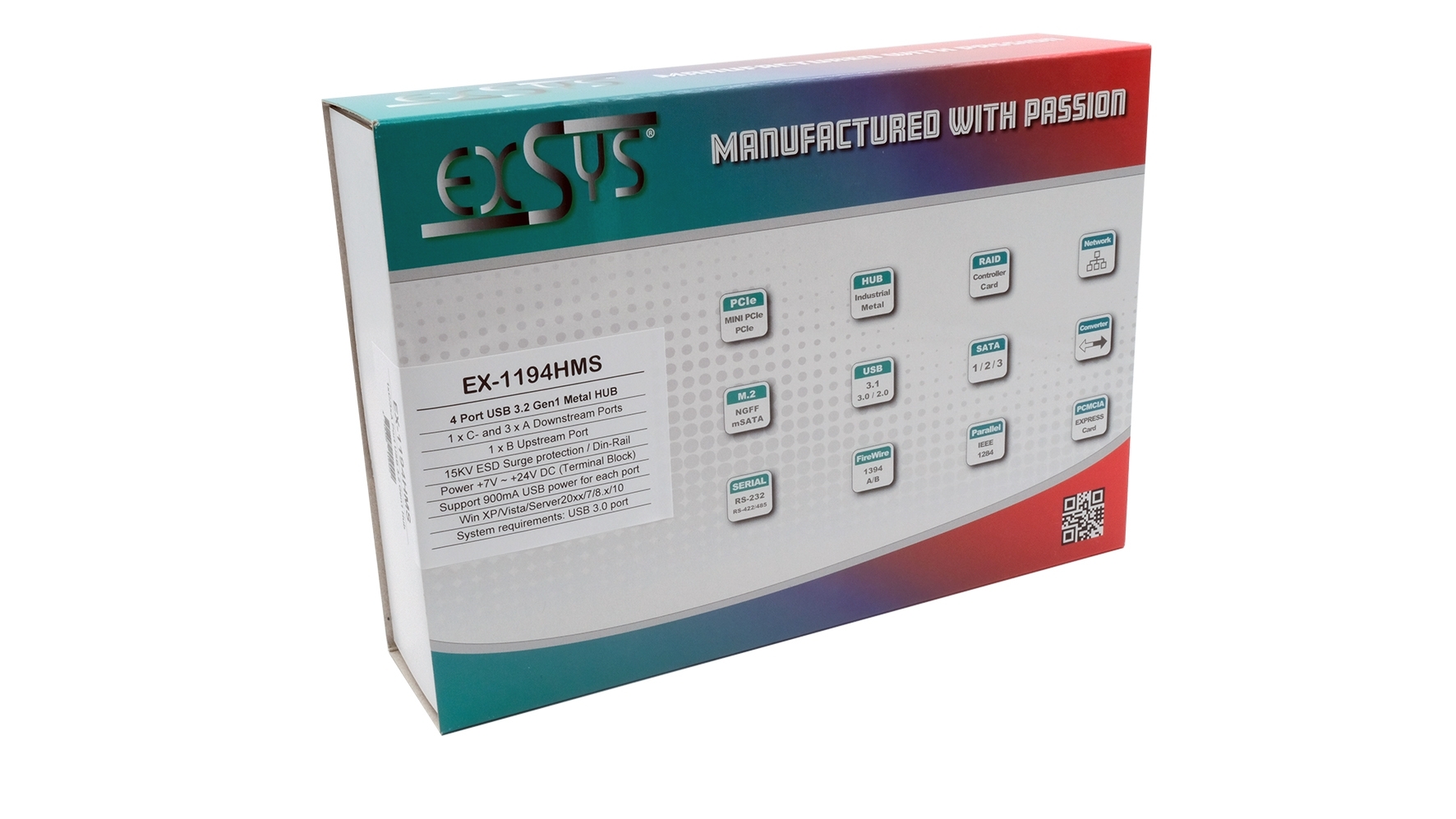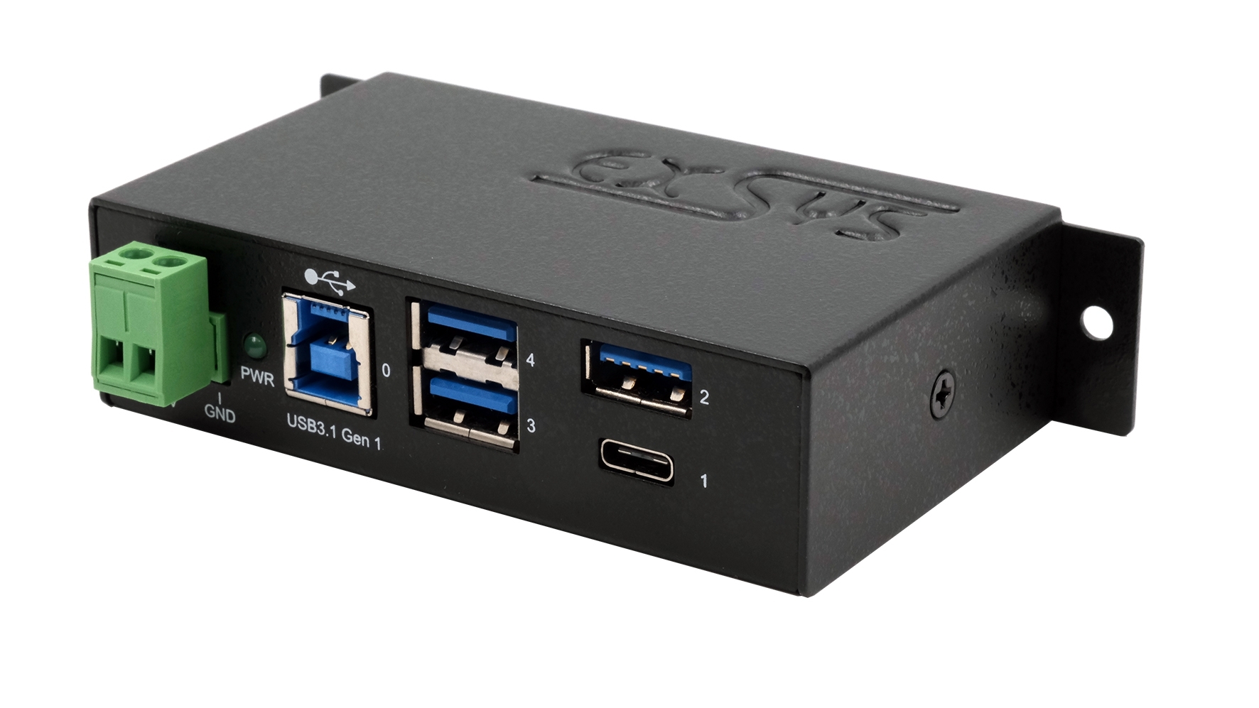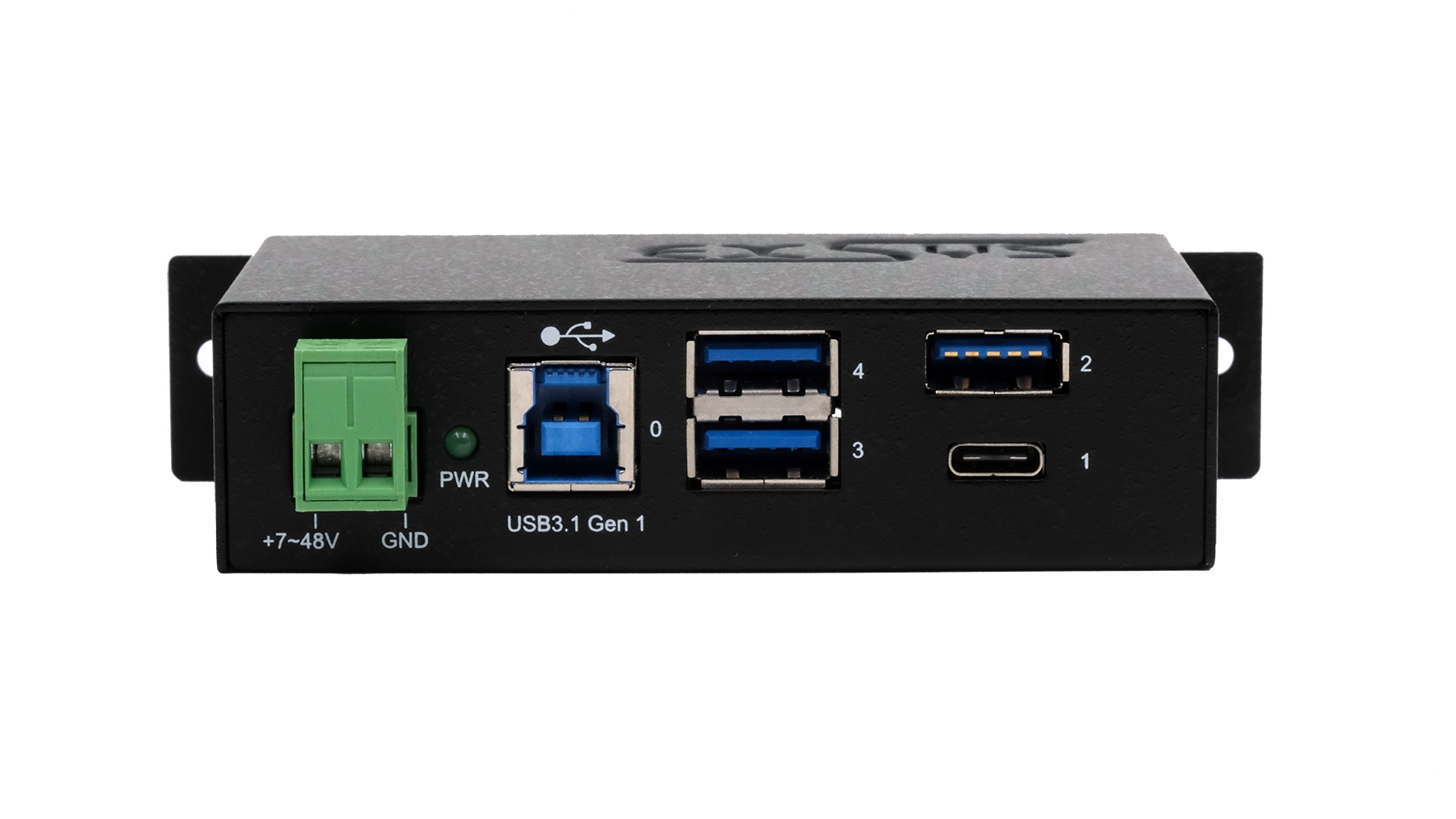 Der EX-1194HMS ist ein USB 3.2 Gen 1 (vorher genannt 3.0) Metall HUB der den Spezifikationen des Universal Serial Bus (USB) Revision 3.2 Gen 1 entspricht und mit einer Datengeschwindigkeit von bis zu 5Gbps arbeitet. Er bietet einen USB-B-Upstream Port und 4 Downstream-Ports mit einem USB-C und drei USB-A Anschlüssen. Der EX-1194HMS unterstützt 15KV ESD Überspannungsschutz für jeden Port. Port 1 ist mit der einer USB-C Buchse ausgestattet. Es ist somit möglich bis zu vier externe USB Peripheriegeräte an einen USB 3.2 Gen 1 Port vom Rechner im 19" Rack anzuschliessen. Der HUB erfüllt die speziellen Anforderungen von Industrieanwendungen.
