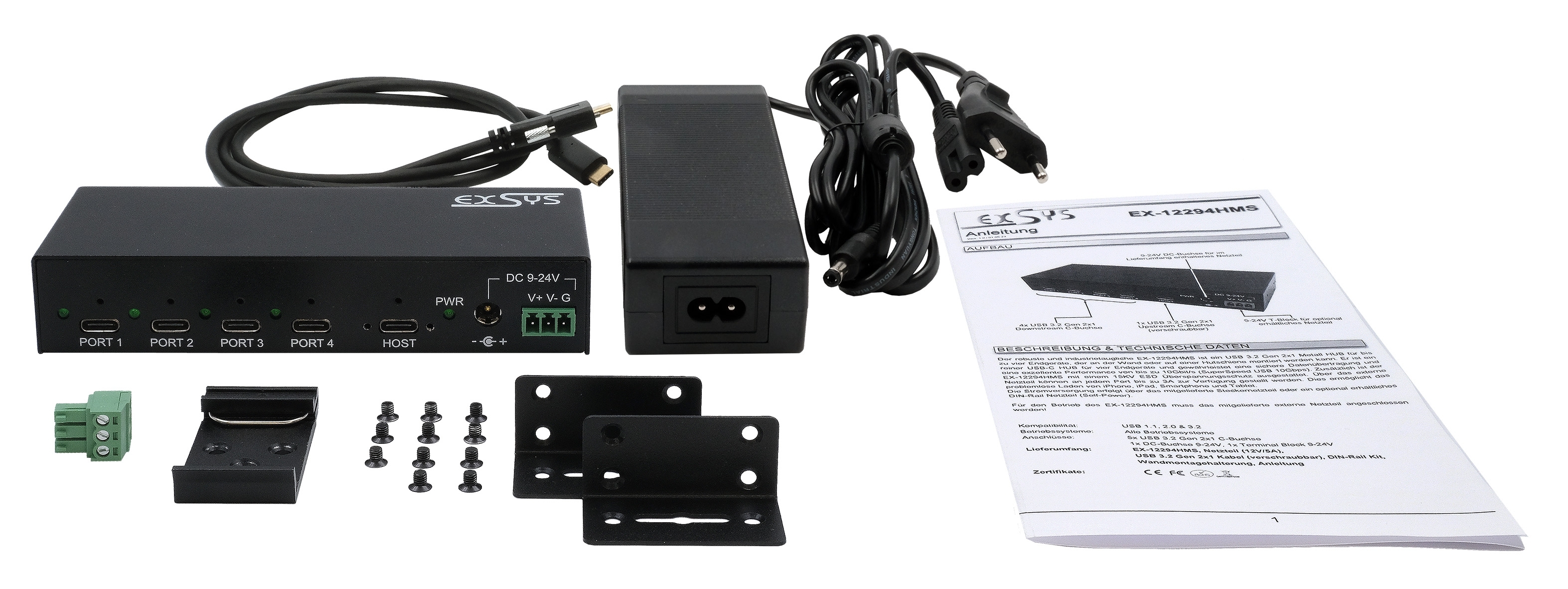 EX-12294HMS, Netzteil (24V/3A), USB 3.2 Gen 2x1 Kabel verschraubbar 1.0 m, DIN-Rail Kit, Wandmontage Kit, Handbuch