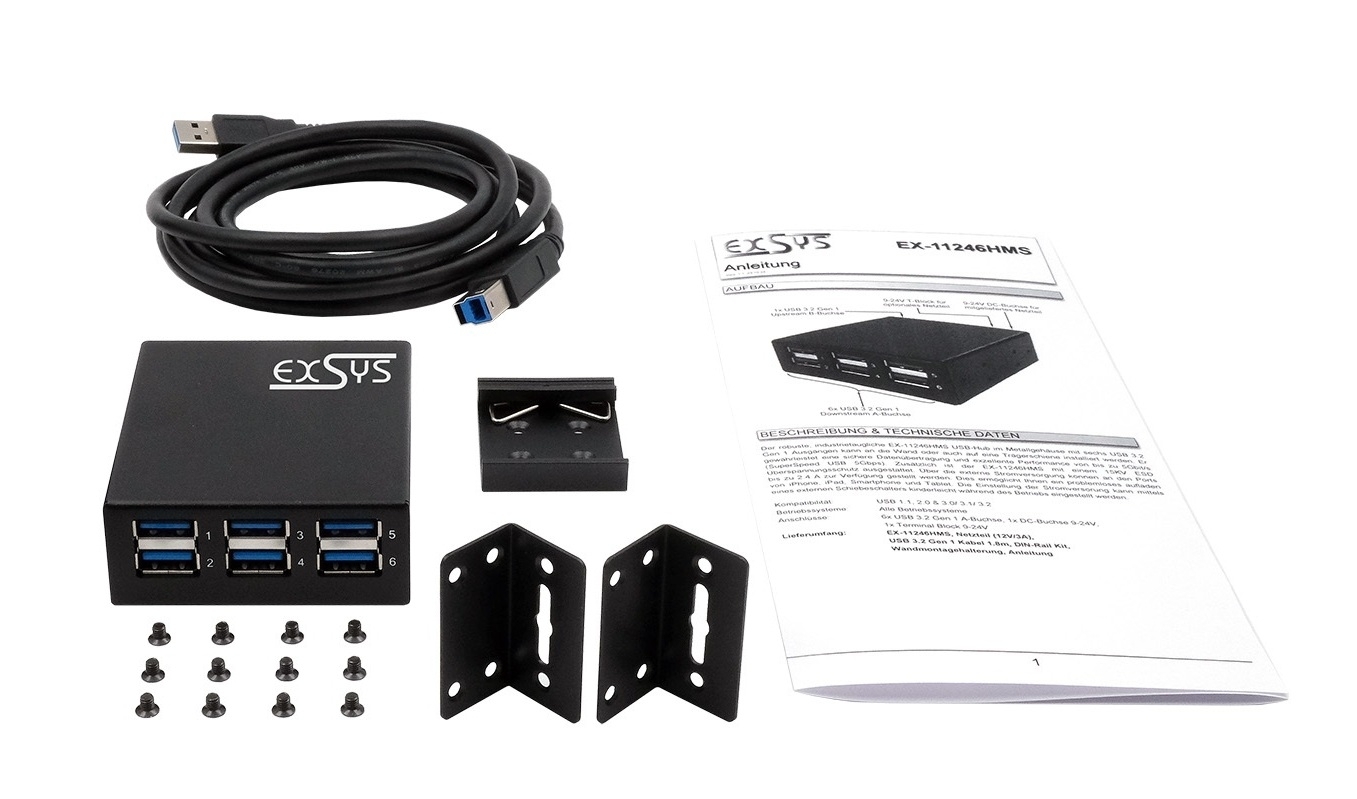 EX-11246HMS, USB 3.2 Gen 1 Kabel 2.0 m, DIN-Rail Kit, Wandmontage Kit, Handbuch