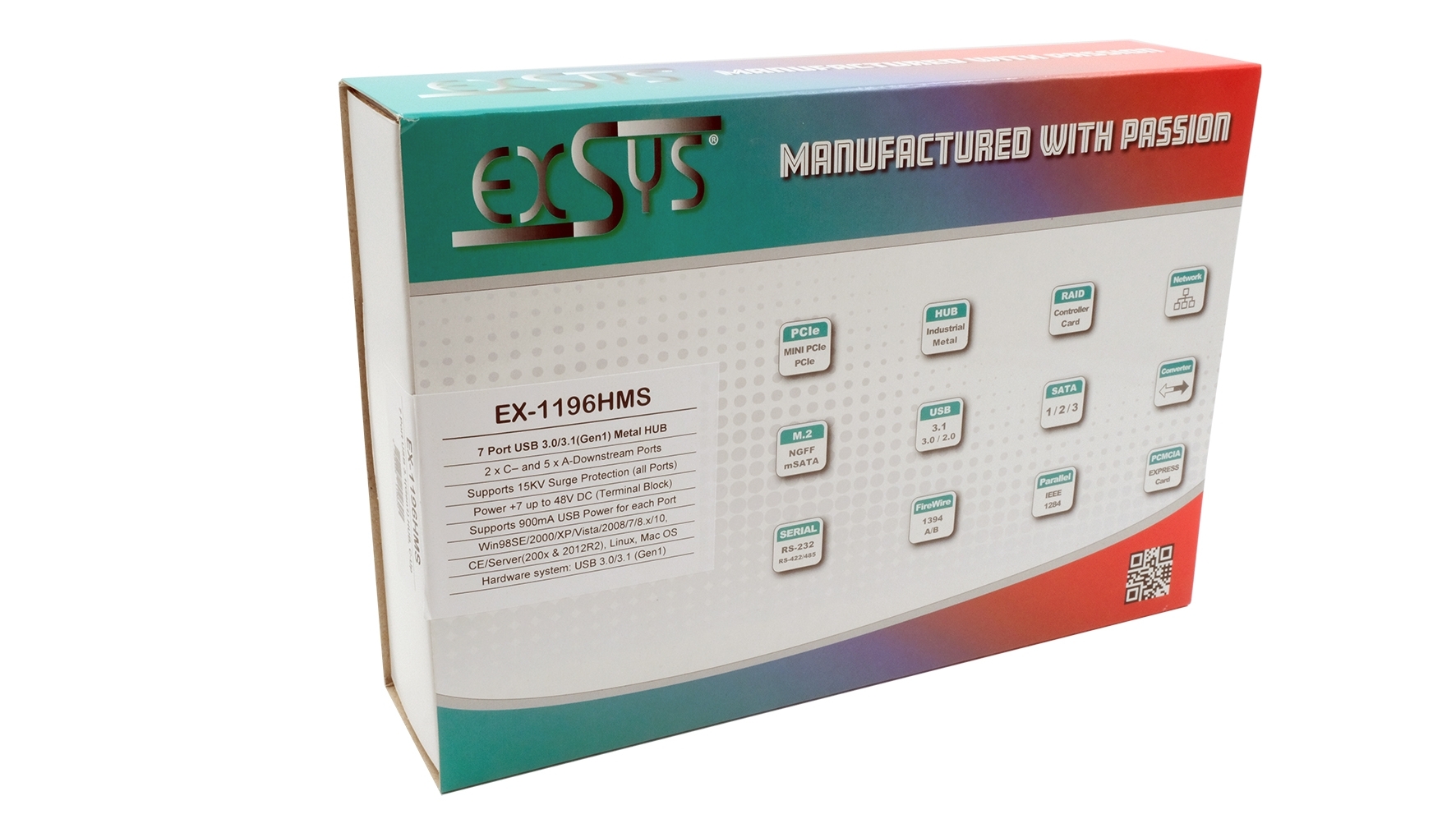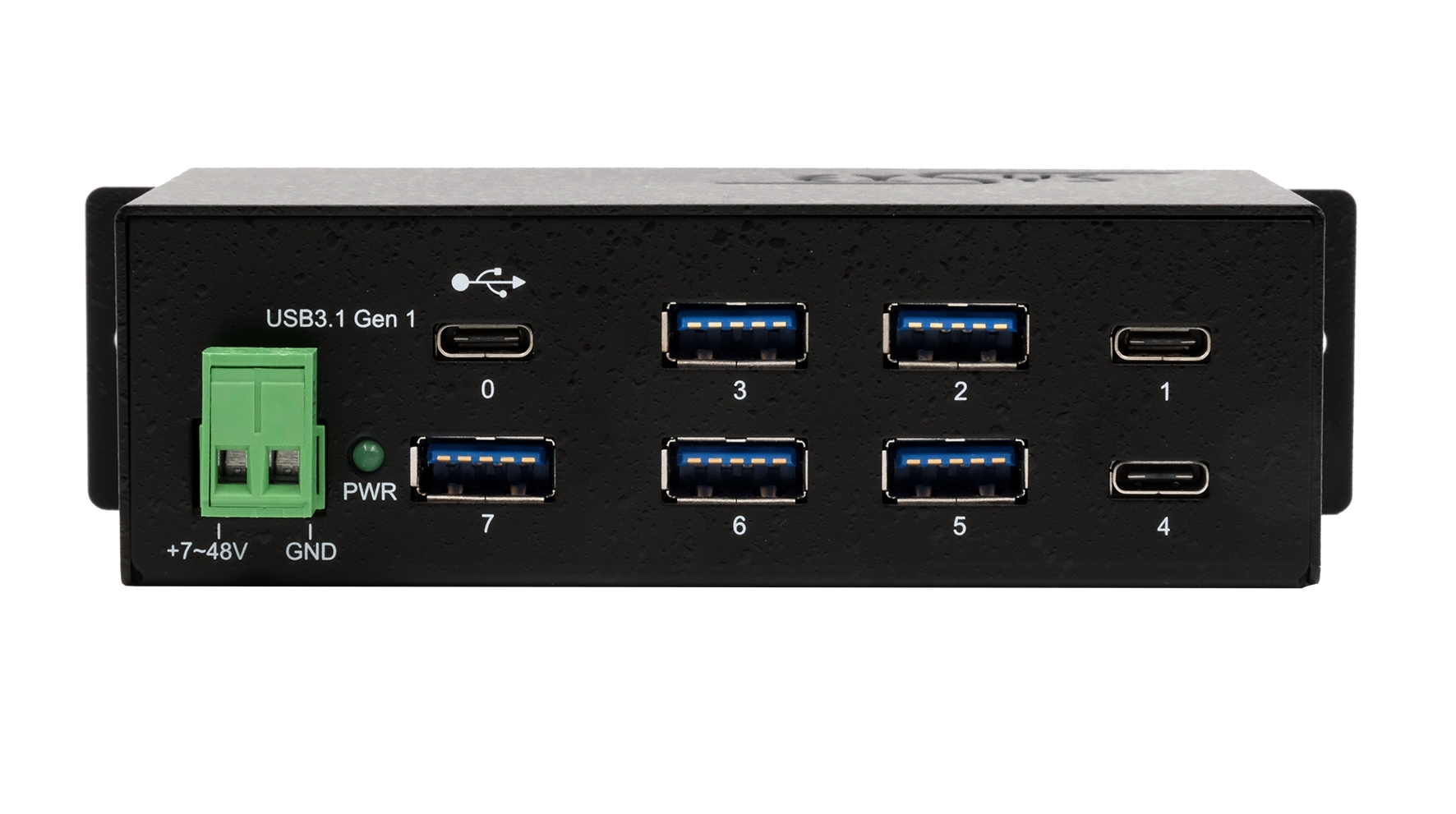 Der EX-1196HMS ist ein USB 3.2 Gen 1 (vorher genannt 3.0) Metall HUB der den Spezifikationen des Universal Serial Bus (USB) Revision 3.2 Gen 1 entspricht und mit einer Datengeschwindigkeit von bis zu 5Gbps arbeitet. Er bietet einen USB-C-Upstream Port und 7 Downstream-Ports mit zwei USB-C und fünf USB-A Anschlüssen. Der EX-1196HMS unterstützt 15KV ESD Überspannungsschutz für jeden Port. Port 1 und 4 sind mit einer USB-C Buchse ausgestattet. Es ist somit möglich bis zu sieben externe USB Peripheriegeräte an einen USB 3.2 Gen 1 Port vom Rechner im 19" Rack anzuschliessen. Der HUB erfüllt die speziellen Anforderungen von Industrieanwendungen.