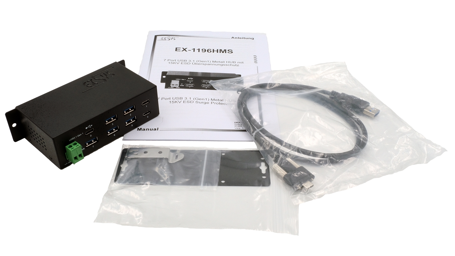 EX-1196HMS, USB A-zu-C 3.2 Gen 1 Kabel, DIN-Rail Kit, Handbuch