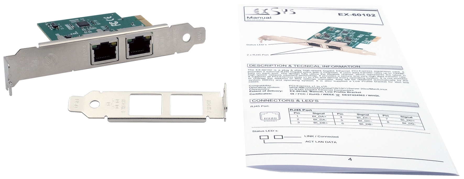 Die EX-60102 ist eine Gigabit Ethernet Karte mit zwei RJ45-Ports für den PCI-Express-Bus. Sie unterstützt Half und Full Duplex sowie NWay Auto-Negotation, um sich automatisch an die Geschwindigkeit im Netzwerk (10/100/1000 Mbit/s.) anzupassen. Weiterhin erkennt die EX-60102 Crossover-Kabel automatisch und bietet eine weitreichende Unterstützung von diversen Betriebssystemen. Mit der Karte wird ein Low Profile Bügel mitgeliefert zum Einbau in ein schmales PC Gehäuse.