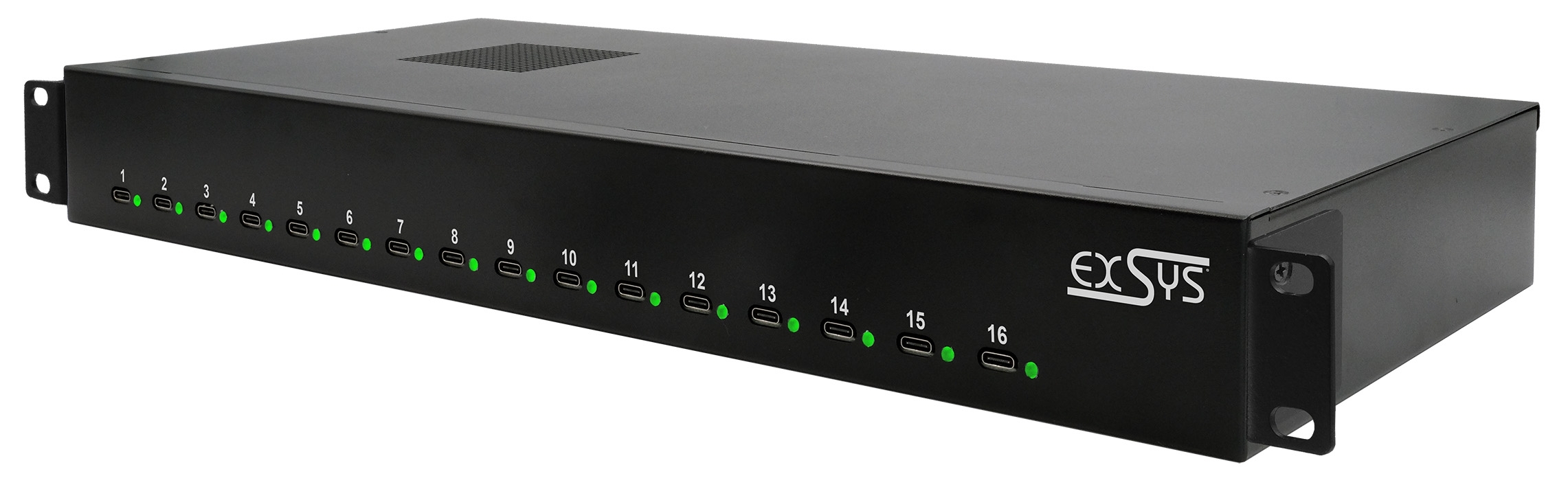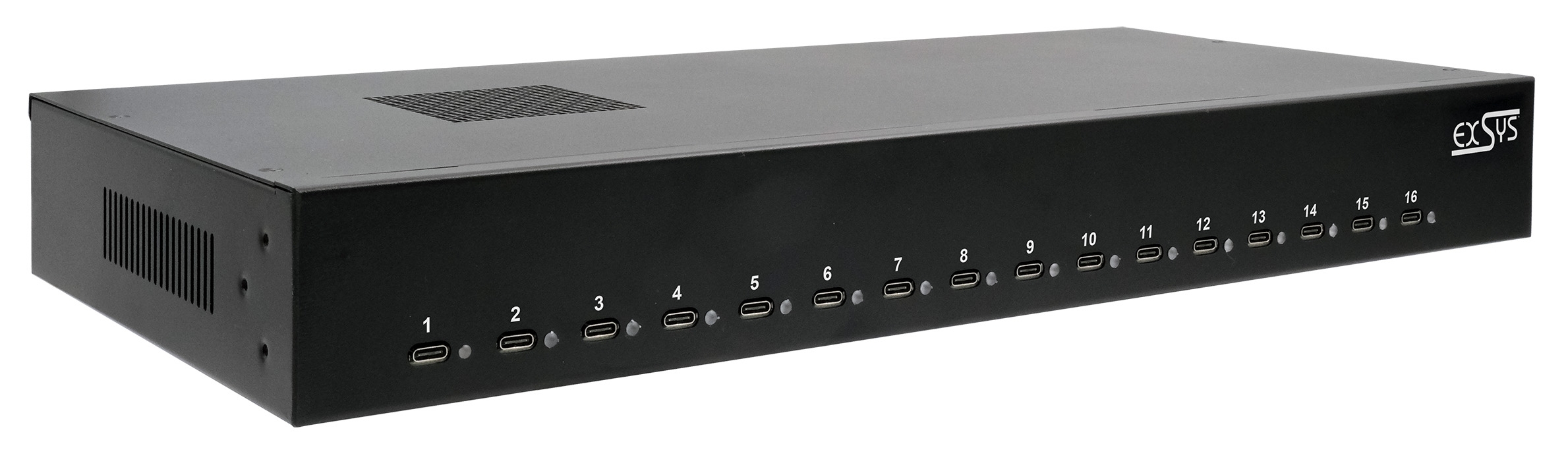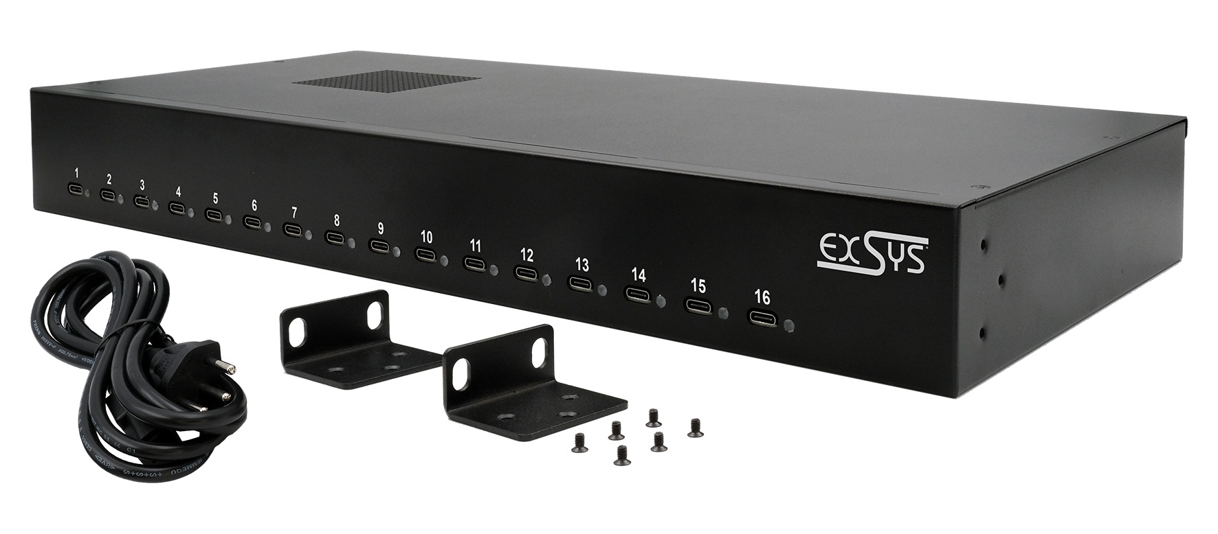 The EX-11016 is a powerful industrial grade charging station with a total power of 480 W. All 16 USB-C ports support Power Delivery (PD) with a maximum charging power of 30 W each. This allows 16 smartphones, tablets and notebooks/MacBooks and other USB-C devices to be charged simultaneously. The temperature-controlled fan automatically switches on when required and thus prevents excessive heat development of the installed power supply. Thanks to the included mounting brackets, the EX-11016 can be installed in a 19"-Rack. It is ideal as a powerful charging station for schools/universities, hotels, restaurants, clubhouses, and more.