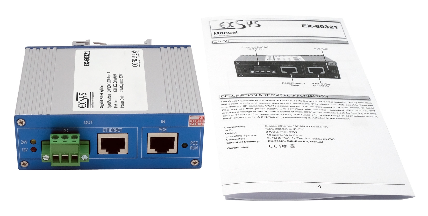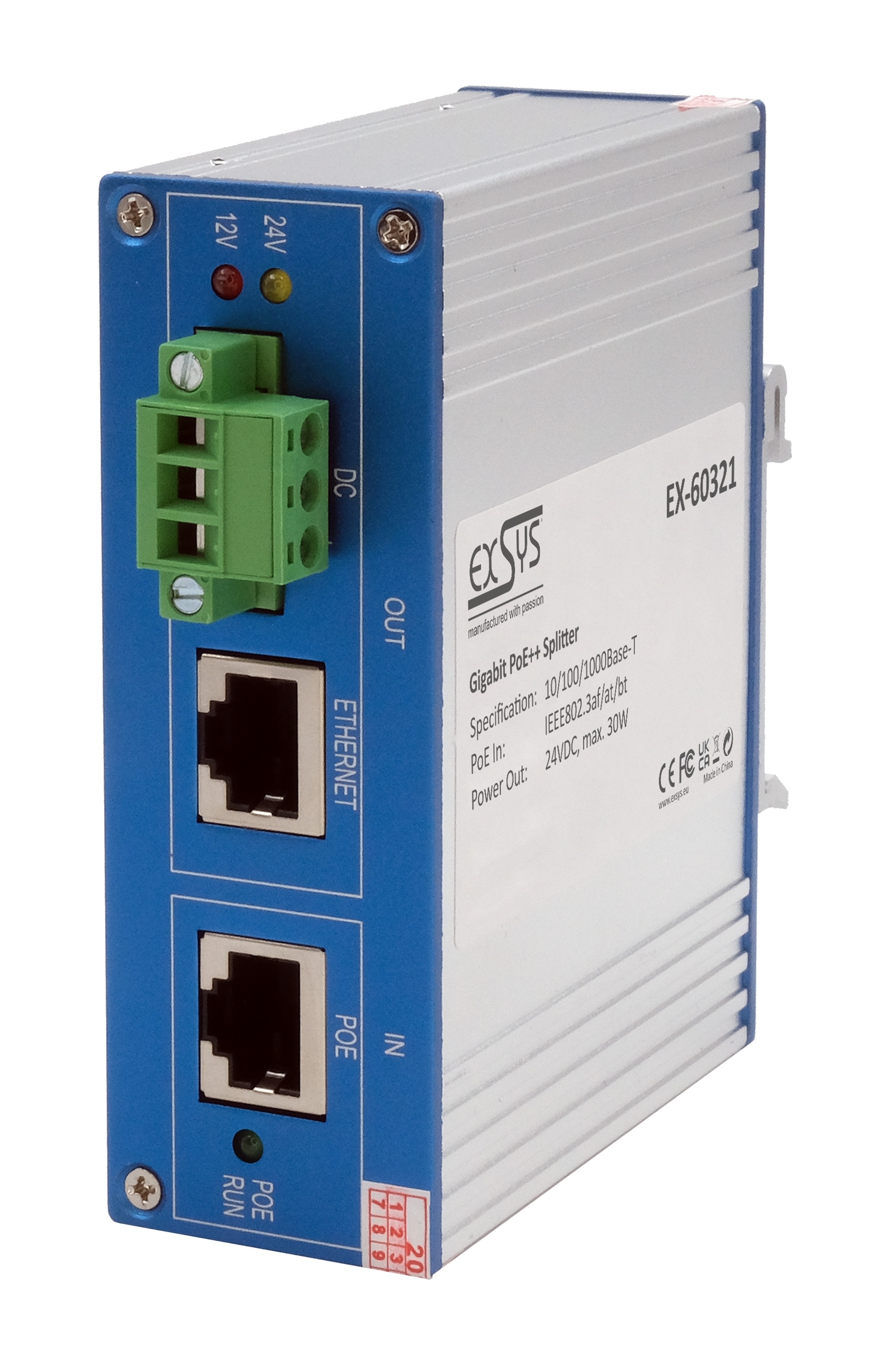 The Gigabit Ethernet PoE+ Splitter EX-60321 splits the signal of a PoE supplier (PSE) into data and power supply and outputs both signals separately. This allows non-PoE-capable Ethernet end devices (IP cameras, WLAN access points...) to be connected to a PoE switch or other PSE and use their power supply. It is compliant with the PoE+ standard IEEE 802.3at and provides a voltage of 24VDC with a power of max. 30W at the terminal block for feeding the end device. Thanks to the robust metal housing, it is suitable for a wide range of applications even in harsh environments. A DIN-Rail Kit (pre-assembled) is included in the delivery.