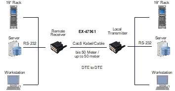 PC to PC connection over RS-232 signal up to 50 meter with Cat. 5/6 cable (DTE - DTE)