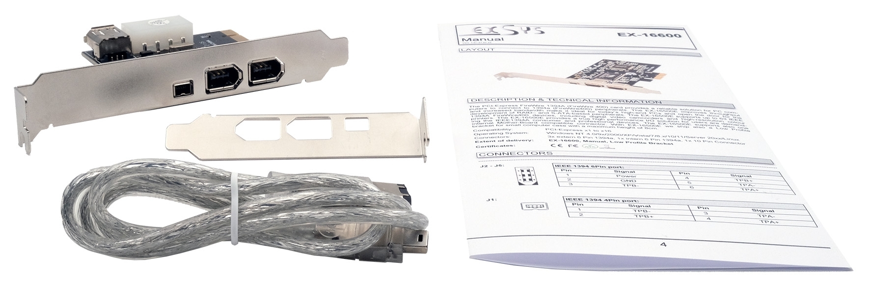 EX-16600, IEEE 1394a cable, low profile bracket, manual
