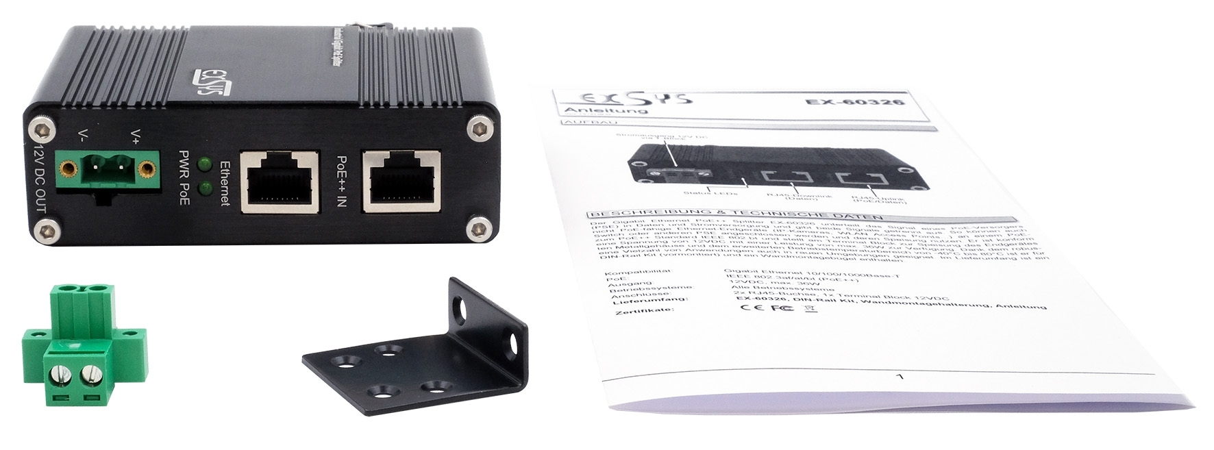 The Gigabit Ethernet PoE+ Splitter EX-60326 splits the signal of a PoE supplier (PSE) into data and power supply and outputs both signals separately. This allows non-PoE-capable Ethernet end devices (IP cameras, WLAN access points...) to be connected to a PoE switch or other PSE and use their power supply. It is compliant with the PoE++ standard IEEE 802.3bt and provides a voltage of 12VDC with a power of max. 36W at the terminal block for feeding the end device. Thanks to the rugged metal housing and the extended operating temperature range from -40°C to 80°C, it is suitable for a wide range of applications even in harsh environments. Included in delivery is a DIN rack kit (pre-assembled) and a wall mounting bracket.