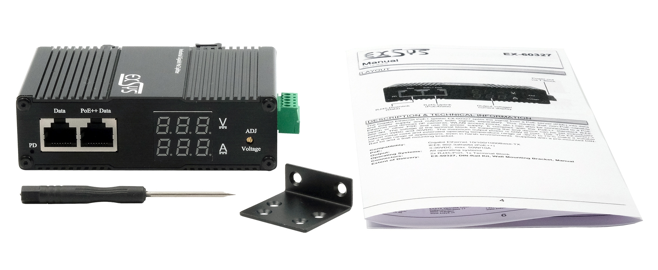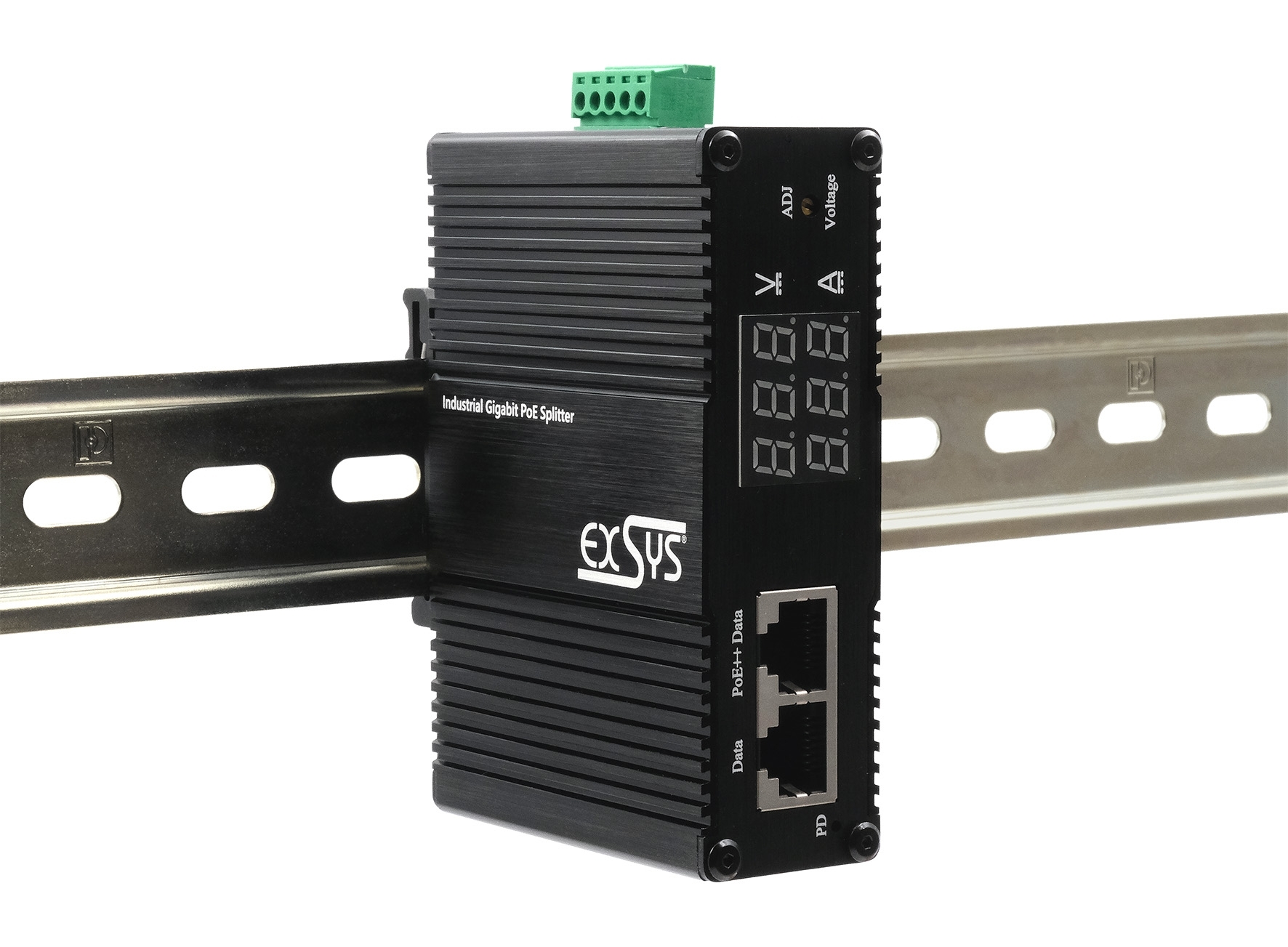 The Gigabit Ethernet PoE++ splitter EX-60327 splits the signal from a PoE server (PSE) into data and power supply and outputs both signals separately. This means that non-PoE-capable Ethernet end devices (IP cameras, WLAN access points, etc.) can also be connected to a PoE switch or other PSE and use its power supply. It complies with the PoE++ standard IEEE 802.3bt. The voltage at the terminal block for supplying the end device can be set individually between 3VDC and 36VDC. The maximum output power is 50W at max. 10A. The EX-60327's robust metal case and extended operating temperature range of -40°C to 75°C make it suitable for a wide range of applications, even in harsh environments. Supplied with a pre-mounted DIN-Rail kit and a wall mounting bracket.