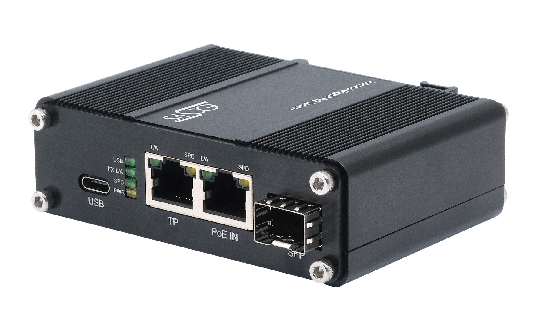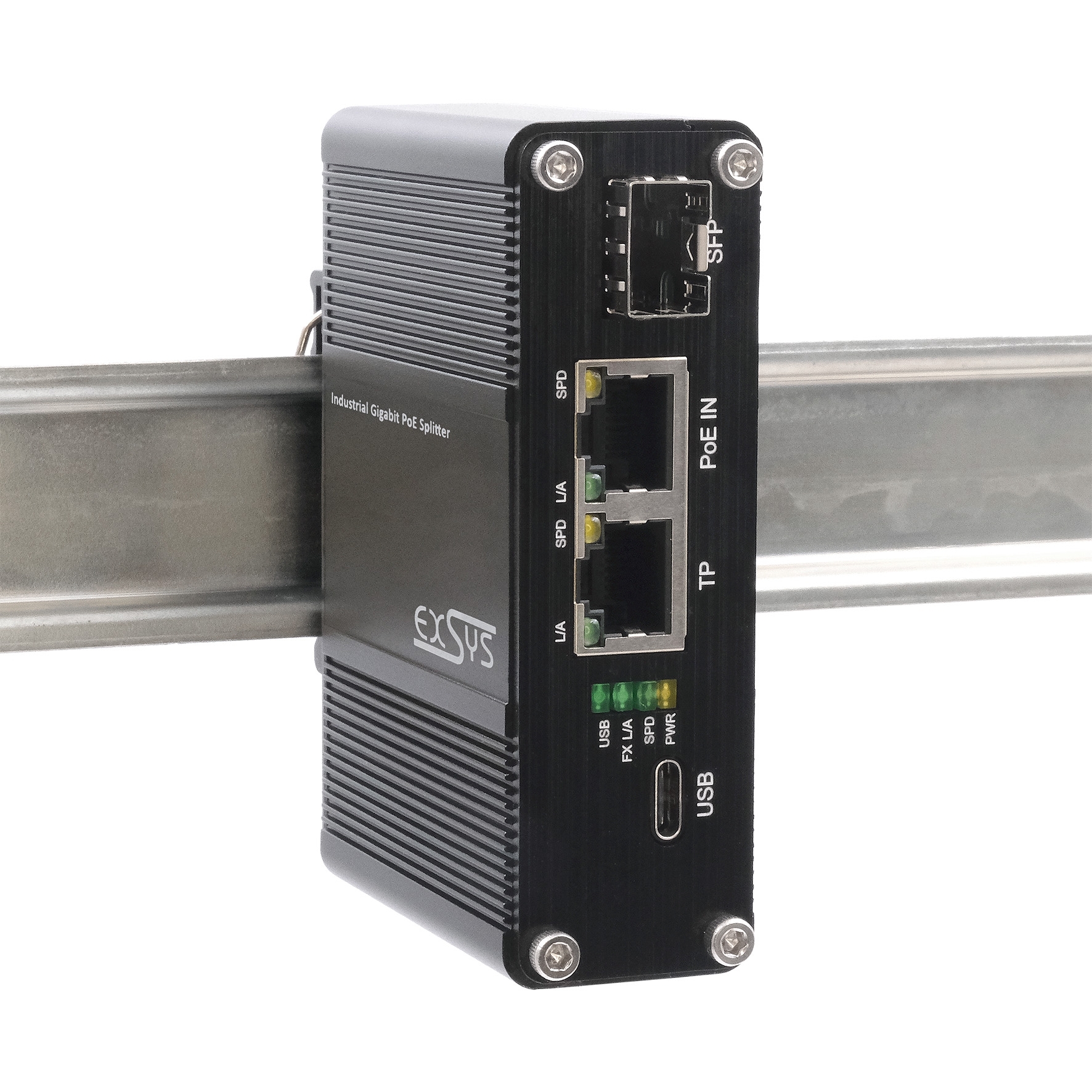 It splits the signal from a PoE (Power over Ethernet) switch into data and power, providing up to 60 W of power via USB Power Delivery (PD) at the USB-C port. At the same time, the USB-C connection acts as a network adapter, enabling the connected computer to access the Ethernet network. Furthermore, the SFP slot enables integration into a fibre optic network. Suitable SFP transceivers are available as accessories. Thanks to its robust metal housing, pre-assembled DIN-Rail kit and supplied wall mounting bracket, the EX-60328 can be used in a wide range of applications, even in harsh environments.