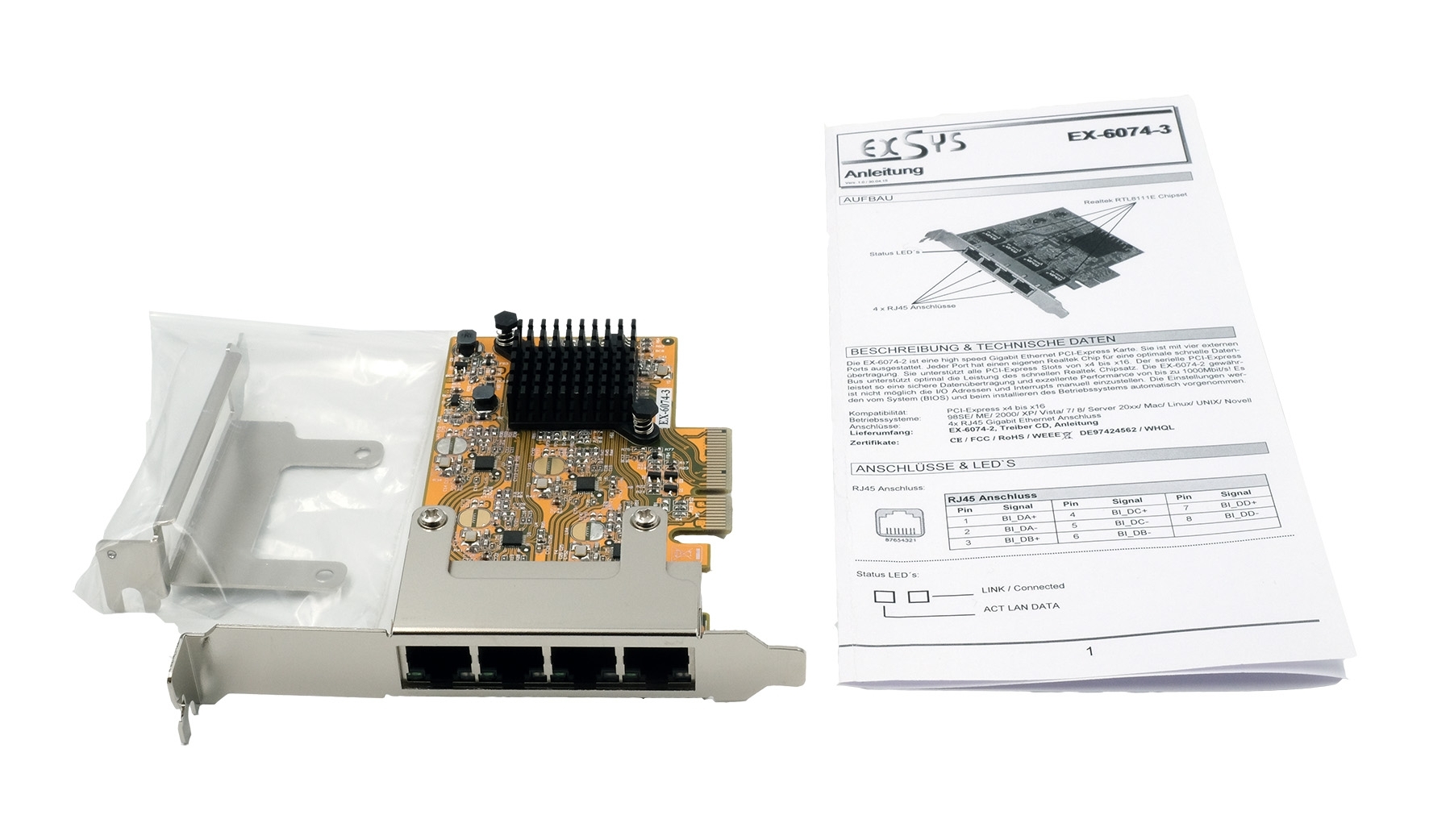 The EX-6074PoE-2 is a fast 1 Gigabit Ethernet card with four RJ45 ports, designed for the PCIe (x1) bus. The EX-6074PoE-2 supports Power over Ethernet and a data transfer rate of up to 1000 Mbit per second. The PCI Express bus optimally supports the performance of the fast Realtek chipset, guaranteeing secure data transfer and excellent performance. Each port has its own Realtek chipset, allowing larger amounts of data to be transferred faster and more efficiently across the network. The EX-6074PoE-2 supports half and full duplex as well as NWay auto-negotation to automatically adapt to the network speed (10/100/1000 Mbps). Furthermore the card is equipped with Auto-MDI/MDI-X. It also offers very extensive support of various operating systems. Any end devices that support Power over Ethernet can be connected to the EX-6074PoE-2 without additional PoE-Switches or PoE-Injectors.