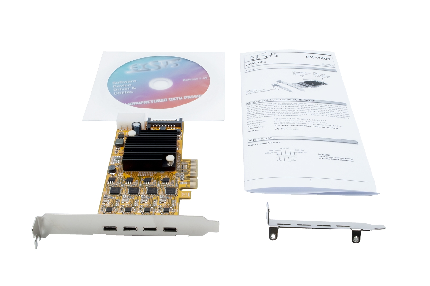 USB 3.2 Gen 1 PCIe (x4) board with four C-ports incl. low profile brackets (4x Renesas chip)
