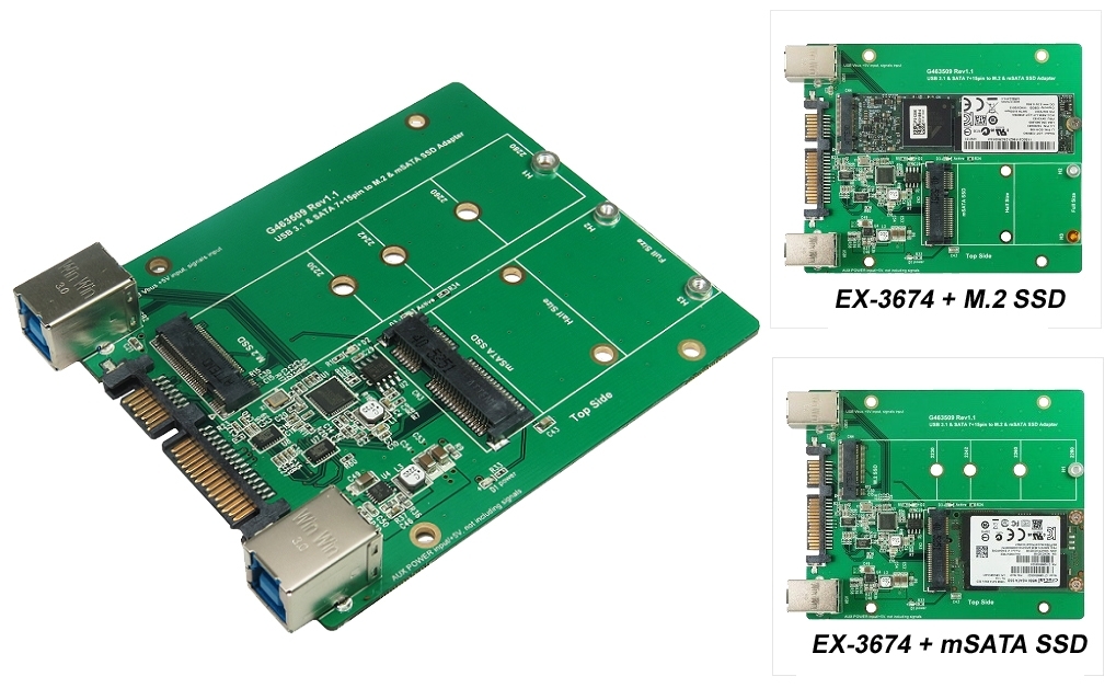 An M.2 SSD module 2280, 2260, 2242 and 2230 type with B-Key or B+M-Key as well as an mSATA module with Half Size or Full Size can be used on the EX-3674. It is connected to the computer via a USB 3.2 or SATA 3 port.
