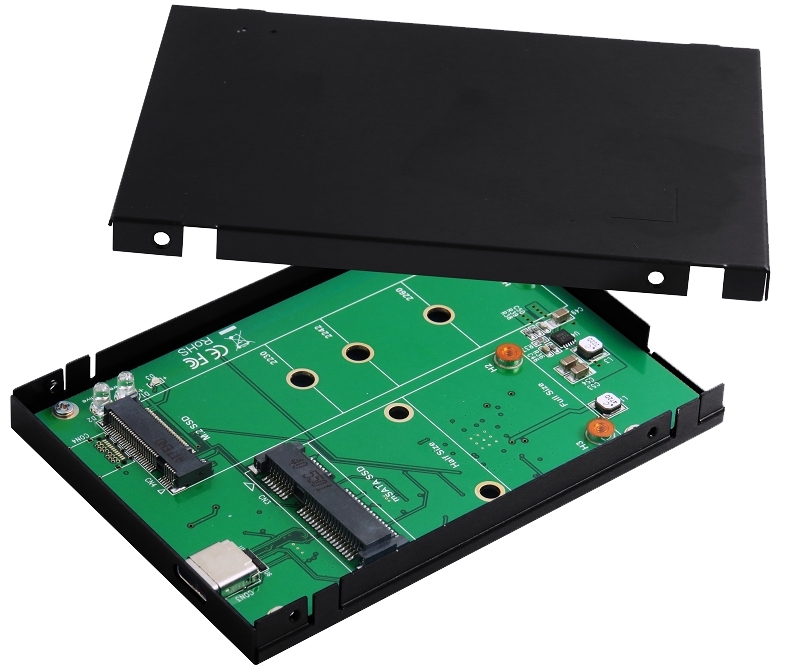 The EX-3672 converter is an external enclosure to replace a 2.5" hard disk or SDD. An M.2 SSD module 2280, 2260, 2242 and 2230 as well as an mSATA module with half size or full size can be used in the enclosure. If you occupy both slots only the M.2 SSD module can be used. The EX-3672 is connected to the computer via a USB port.