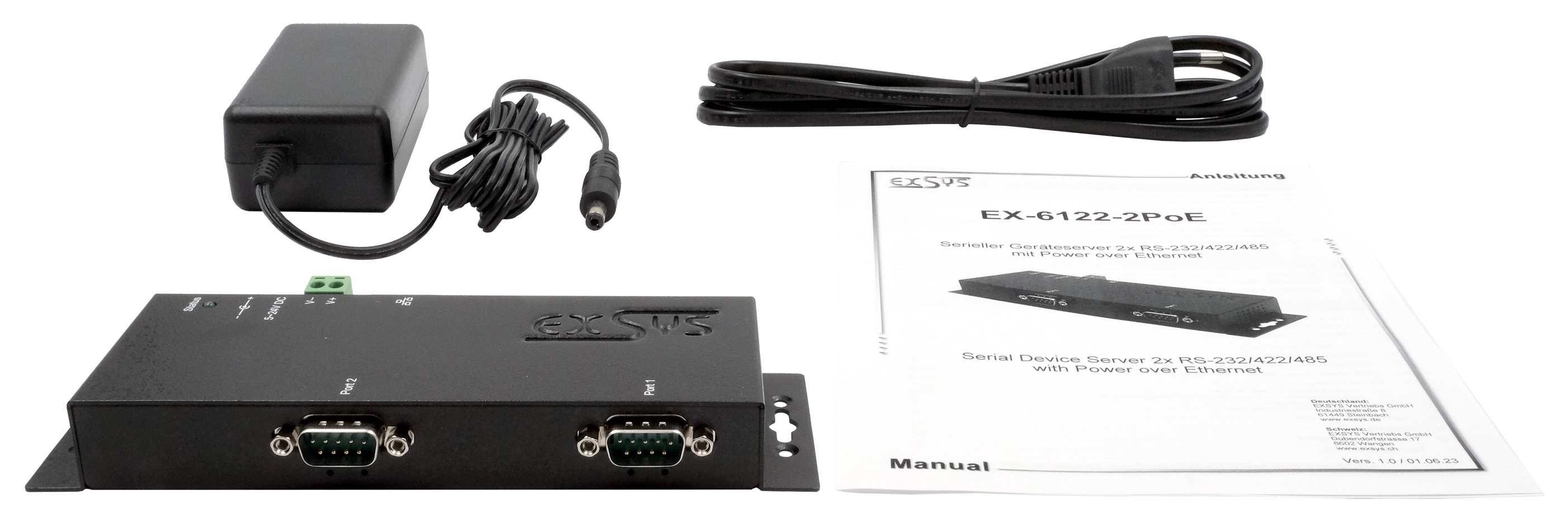 Lieferumfang: EX-6122-2PoE, Netzteil 12V/3A, Handbuch