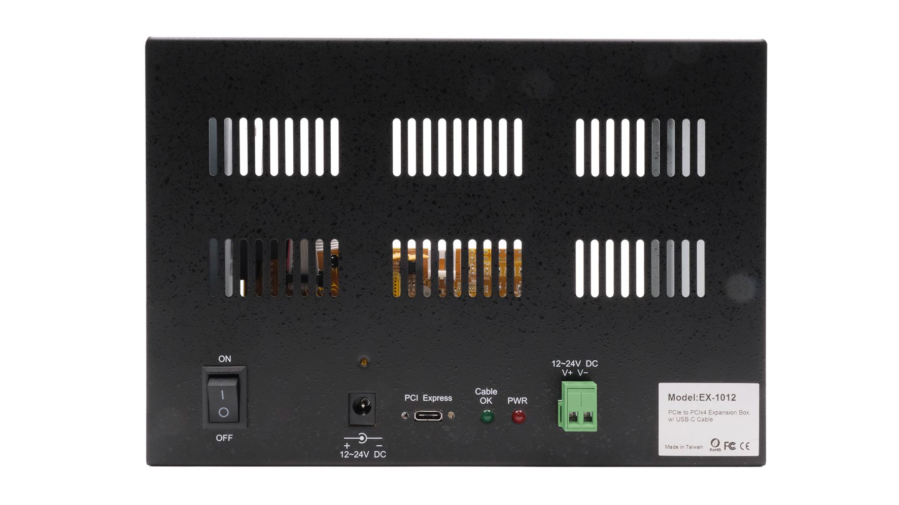 Die EX-1012 ist eine externe Erweiterungs-Box mit vier PCI-Slot‘s zur Erweiterung oder Ergänzung von PCI-Anschlüssen über einen PCI-Express-Slot. Für die Einstellungen der I/O Adressen und Interrupts sind keine Jumper notwendig, da diese automatisch vom Mainboard vergeben werden. Die EX-1012 kann zusätzlich zu den Mainboard PCI-Anschlüssen betrieben werden und unterstützt alle Standard PCI I/O Karten (z.B. Seriell, Parallel, USB, FireWire usw…) mit 5 & 3,3 Volt. Im Lieferumfang enthalten ist eine PCIe-Host-Adapterkarte, ein USB-C-Erweiterungskabel und die Erweiterungs-Box selbst. Die EX-1012 bietet eine sofortige PCI-Bus-Erweiterung über den PCI-Express-Slot eines beliebigen Computersystems. Es werden keine Treiber oder Software zur Installation benötigt. Mit der EX-1012 wird ein externes 12V/3A Netzteil mitgeliefert.