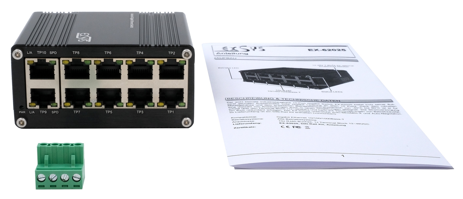 Der wohl kleinste industrietaugliche 10-Port Gigabit PoE-Switch EX-62025PoE bietet trotz seiner äusserst geringen Aussenmaße volle Gigabit Leistung an allen 10 Ports. An acht Downlink-Ports stehen jeweils bis zu 30W für den Anschluss von PoE Power Devices (PD) wie z.B. IP-Kameras oder IP-Telefone zur Verfügung. Dank dem robusten Metallgehäuse und dem erweiterten Betriebstemperaturbereich von -40°C bis 80°C ist er für eine Vielzahl von Anwendungen auch in rauen Umgebungen geeignet. Die Stromversorgung erfolgt über den Terminal Block (48~57VDC) und kann zur Verminderungen von Betriebsausfällen auch redundant erfolgen. Der EX-62025PoE unterstütz Auto-MDI/MDI-X und Auto-Negotation.