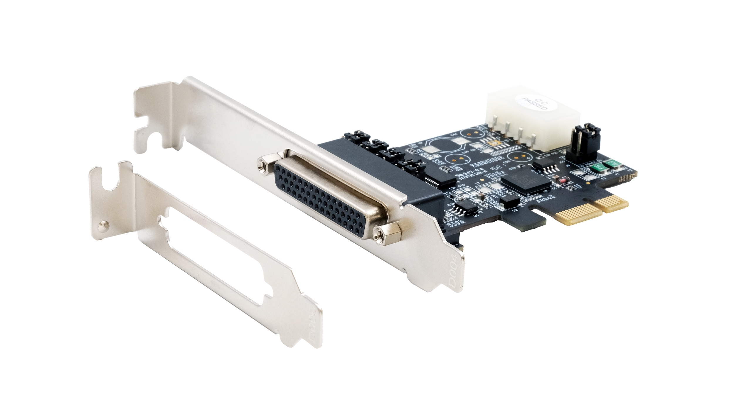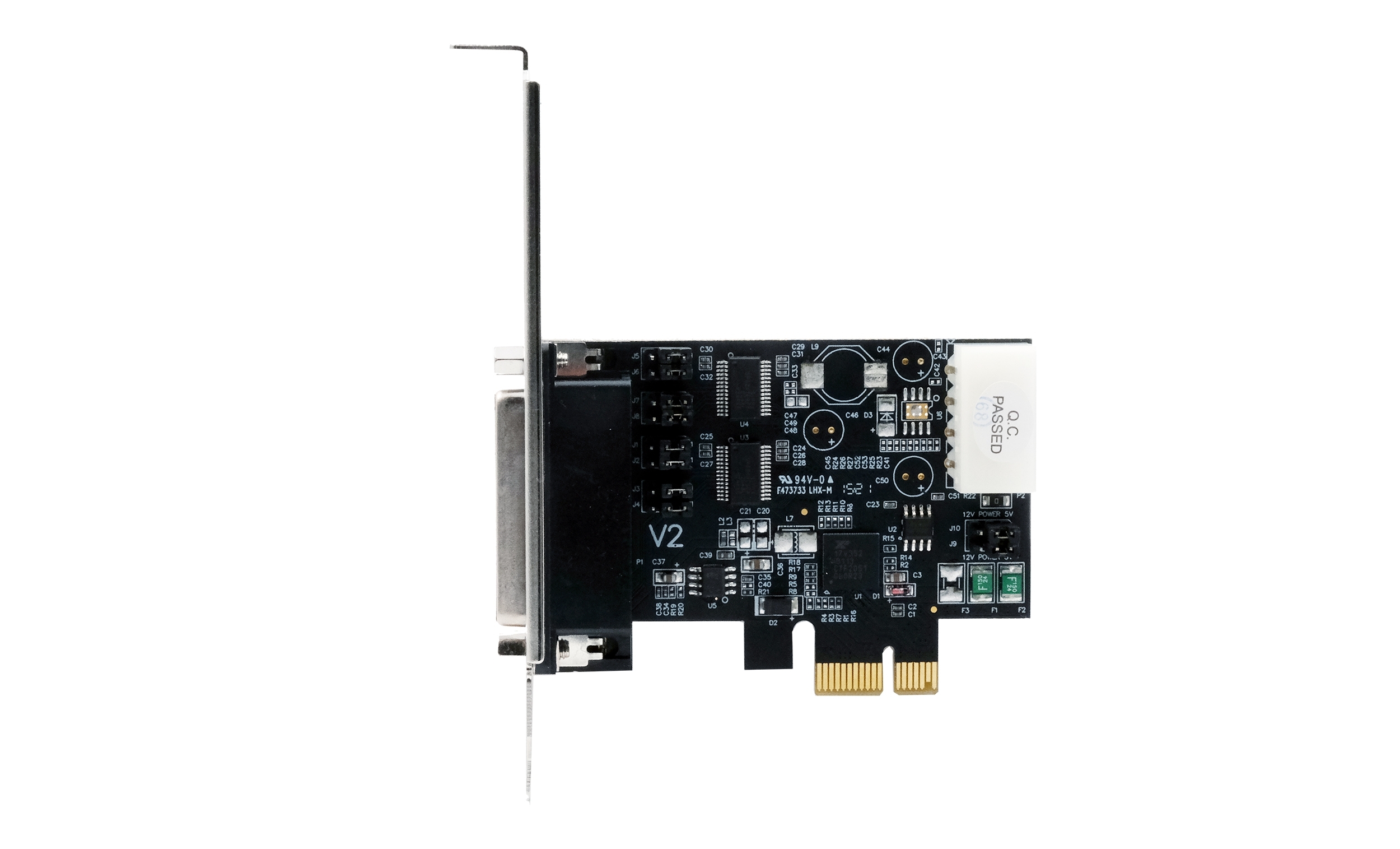 Die EX-46022 PCI-Express-I/O-Karte verfügt über zwei serielle RS-232-High-Performance-UART-16C550-Ports. Die Karte wurde entwickelt, um zwei weitere seriellen Ports für PC, kleine Workstations oder Server über den PCIe-Bus zu erweitern. Darüber hinaus besteht die Möglichkeit, die Spannung von +5 V oder +12 V auf die Pins 1, 4, 8 und 9 des seriellen Steckers einzustellen, um ein POS-System (Power over System) zu realisieren. Bitte beachten Sie, dass die beiden 9-Pin-Anschlüsse mittels eines Octopus-Kabels verbunden werden und mit der Karte ein Low Profile Bügel mitgeliefert wird. Die EX-46022 ist somit auch für schmale Computergehäuse mit einer Bauhöhevon bis zu 8 cm konzipiert.