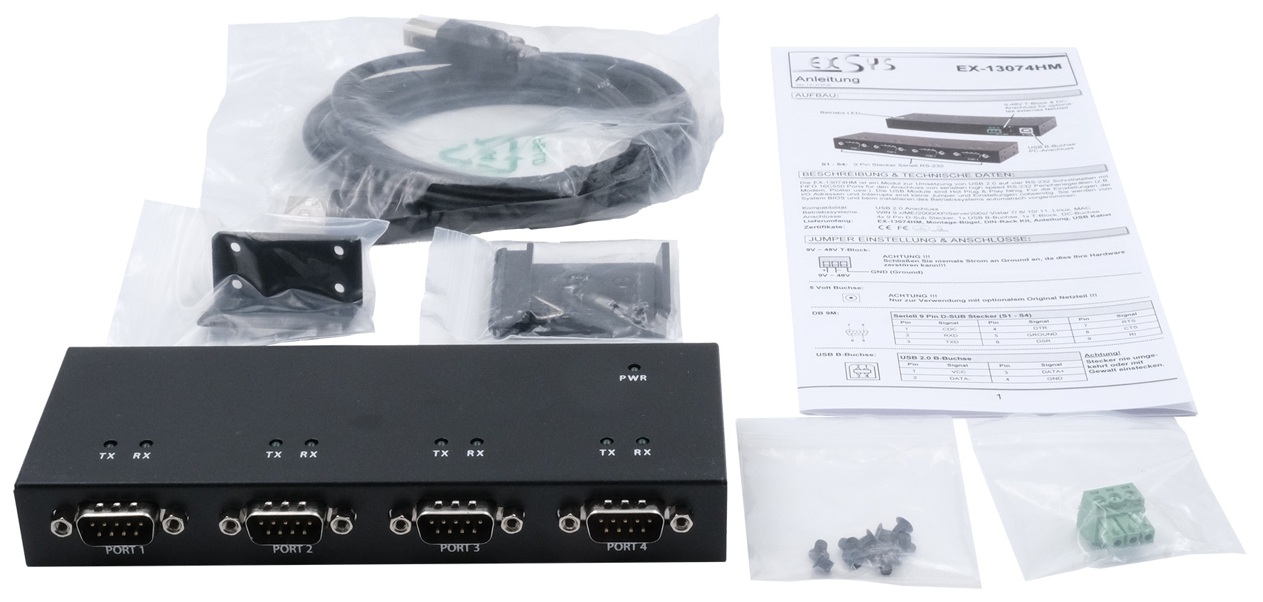 EX-13074HM, USB Kabel, DIN-Rail Kit, Wandmontage Kit, Terminal Block, Handbuch