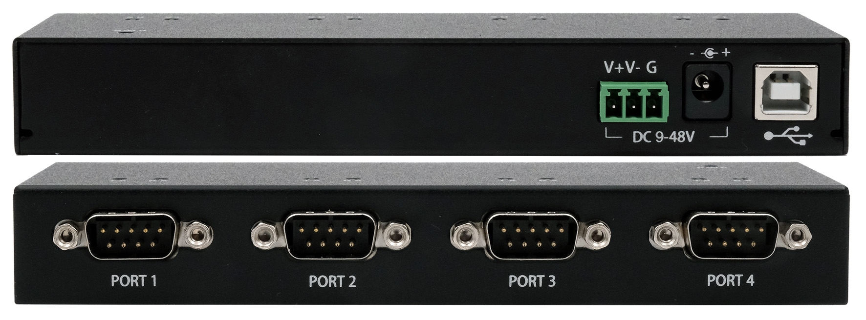 Der EX-13074HM USB 2.0 zu RS-232 Konverter in einem Metallgehäuse stellt vier serielle RS-232 High Performance UART 16C550 Ausgänge zur Verfügung. Er wurde entwickelt um Desktop Computer oder Notebook um vier weitere serielle Ausgänge in einem robustem Metallgehäuse über den USB 2.0 Bus zu erweitern. Der EX-13074HM verfügt über LED Anzeigen für die Datenübertragung an jedem Port und wird mit zwei Bügeln zur Wandmontage und einem DIN-Rail-Kit zum anbringen auf einer Trägerschiene in einem 19“ Rack geliefert. Zur optionalen Stromversorgung stehen ein Terminal Block und eine DC-Buchse zur Verfügung.